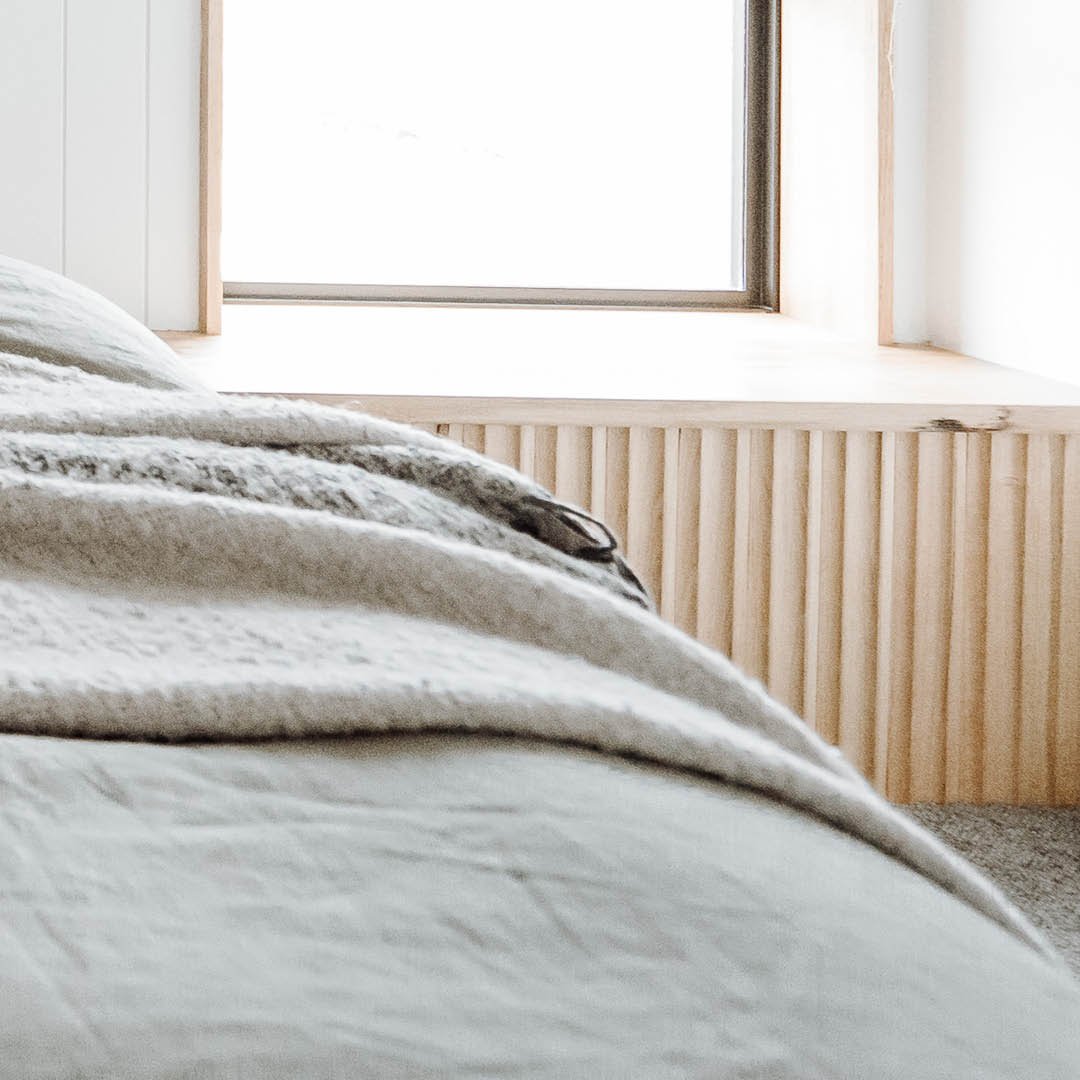 “We barely had enough width for a bedside table and wanted to add the warmth of timber to the room,” says Katrina. “So, for a couple of hundred extra dollars, we turned our standard order window into a bench seat/bedside table combo.”