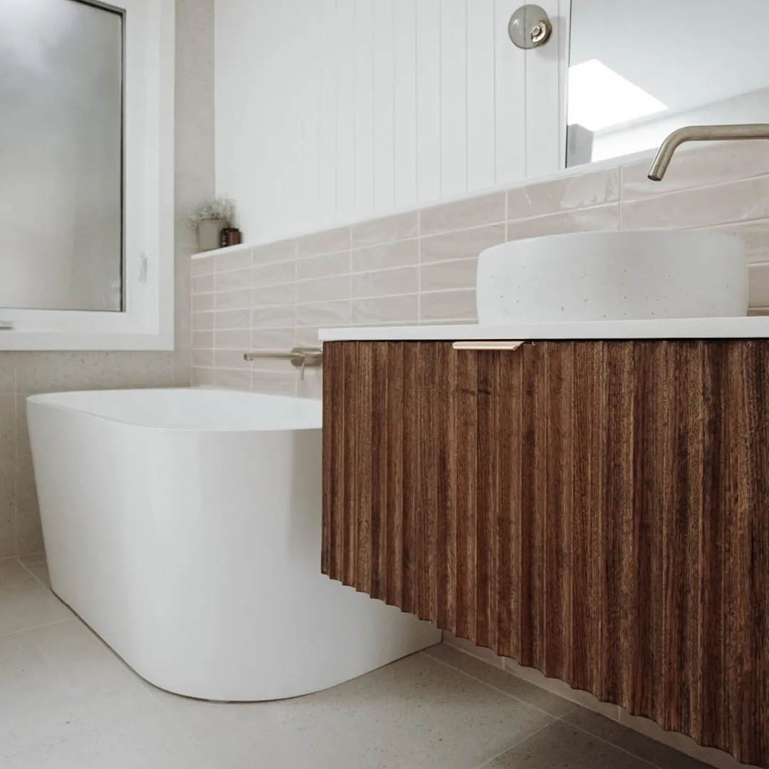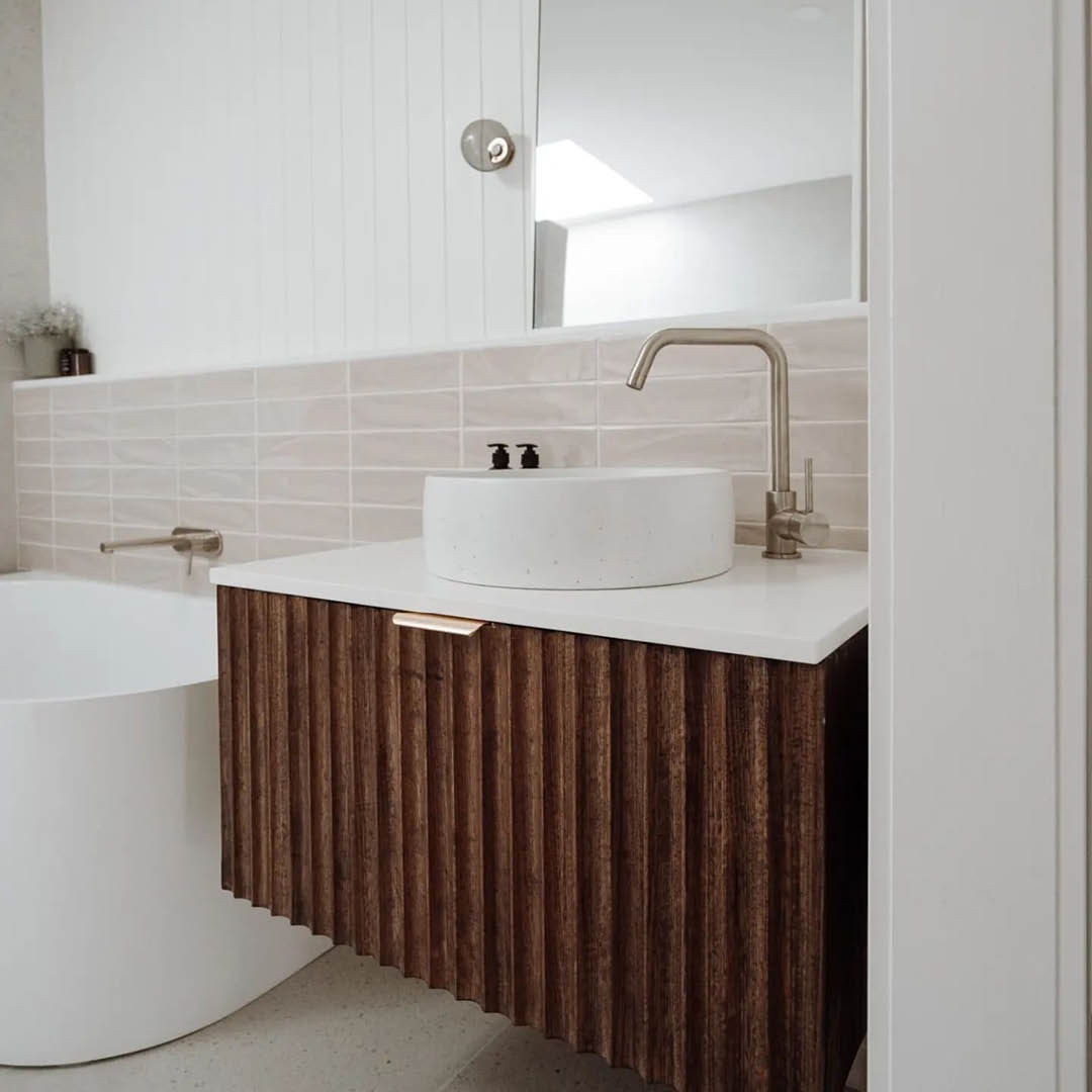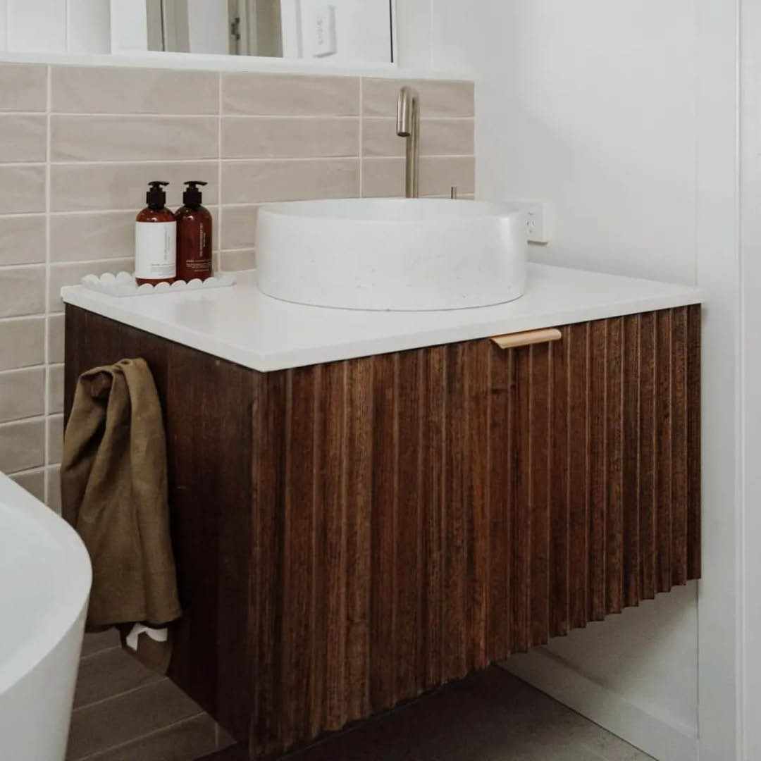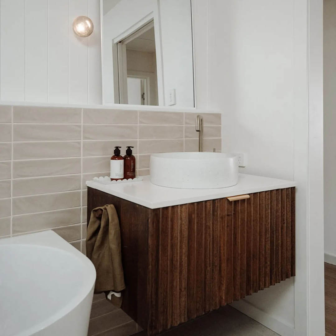 Made from left over timber from a previous project, Katrina and Jesse from The Reno Life created a stunning bespoke vanity for their bathroom.