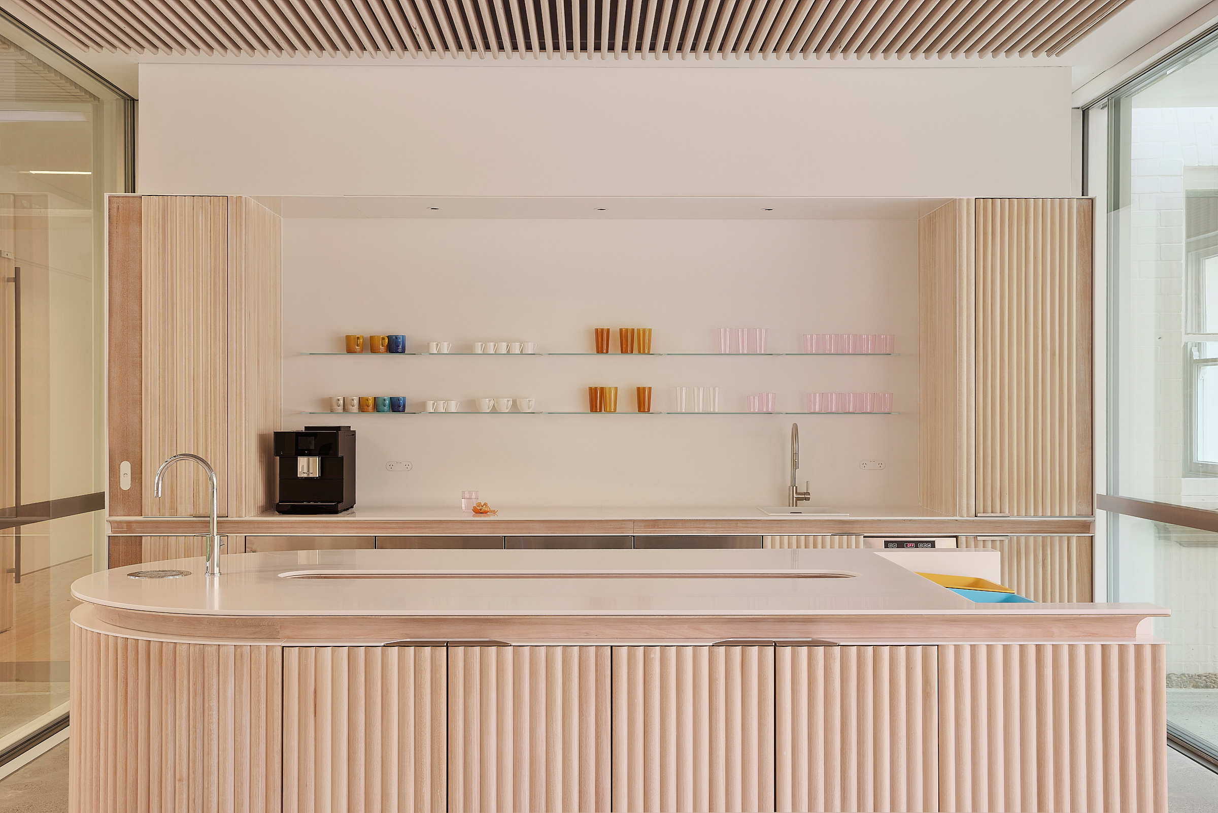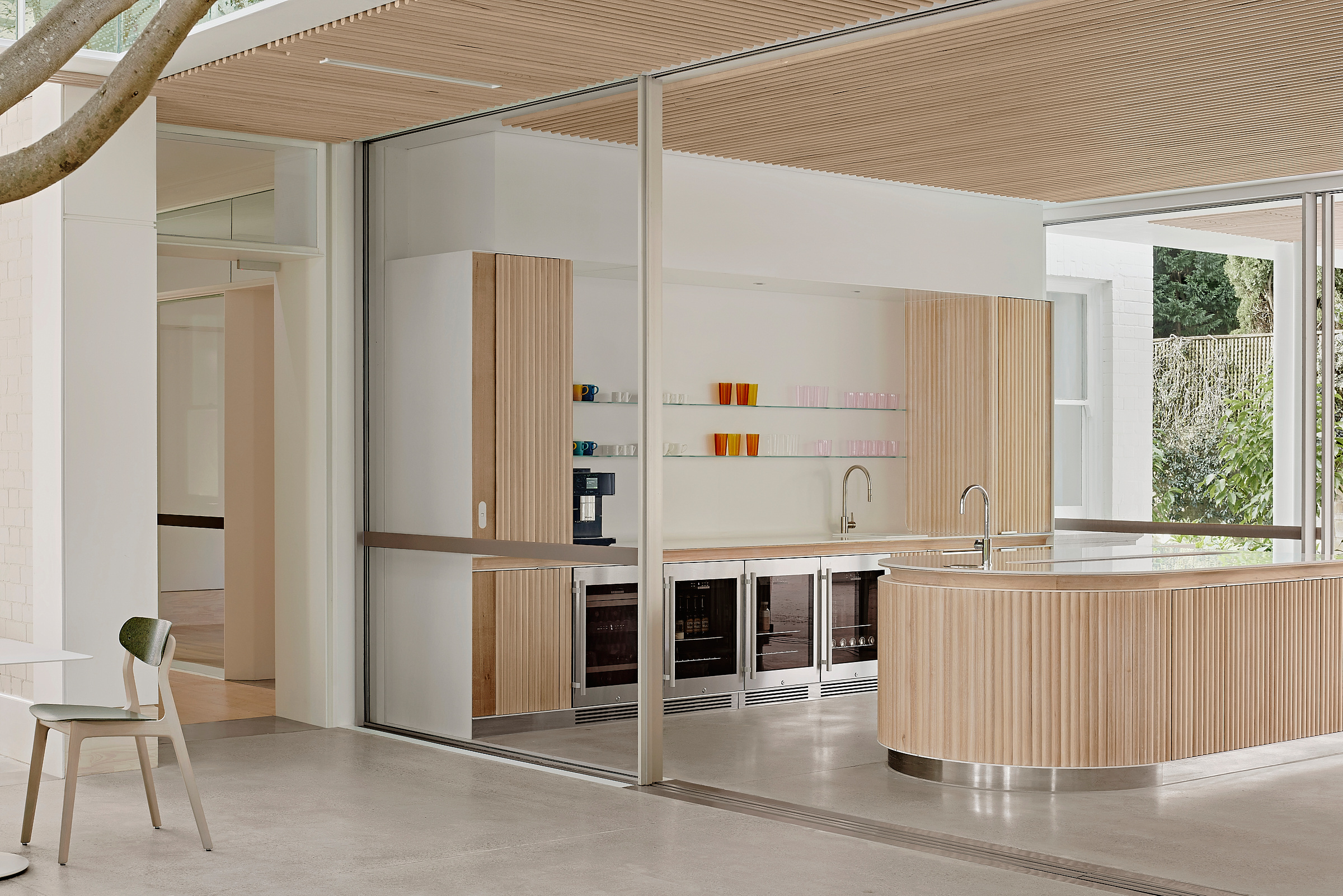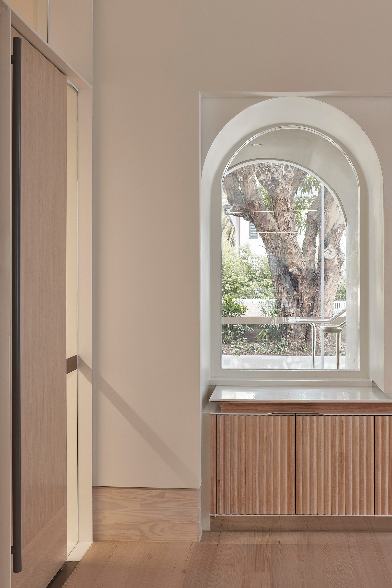 "The geometry of the half-round curve speaks to arched windows, bay windows, and ornate sandstone mouldings on the Federation building," Kachwalla explains. This thoughtful selection not only complements the Tasmanian Oak floors but also enhances the overall brightness and warmth of the space, showcasing the versatility and beauty of Porta’s products.