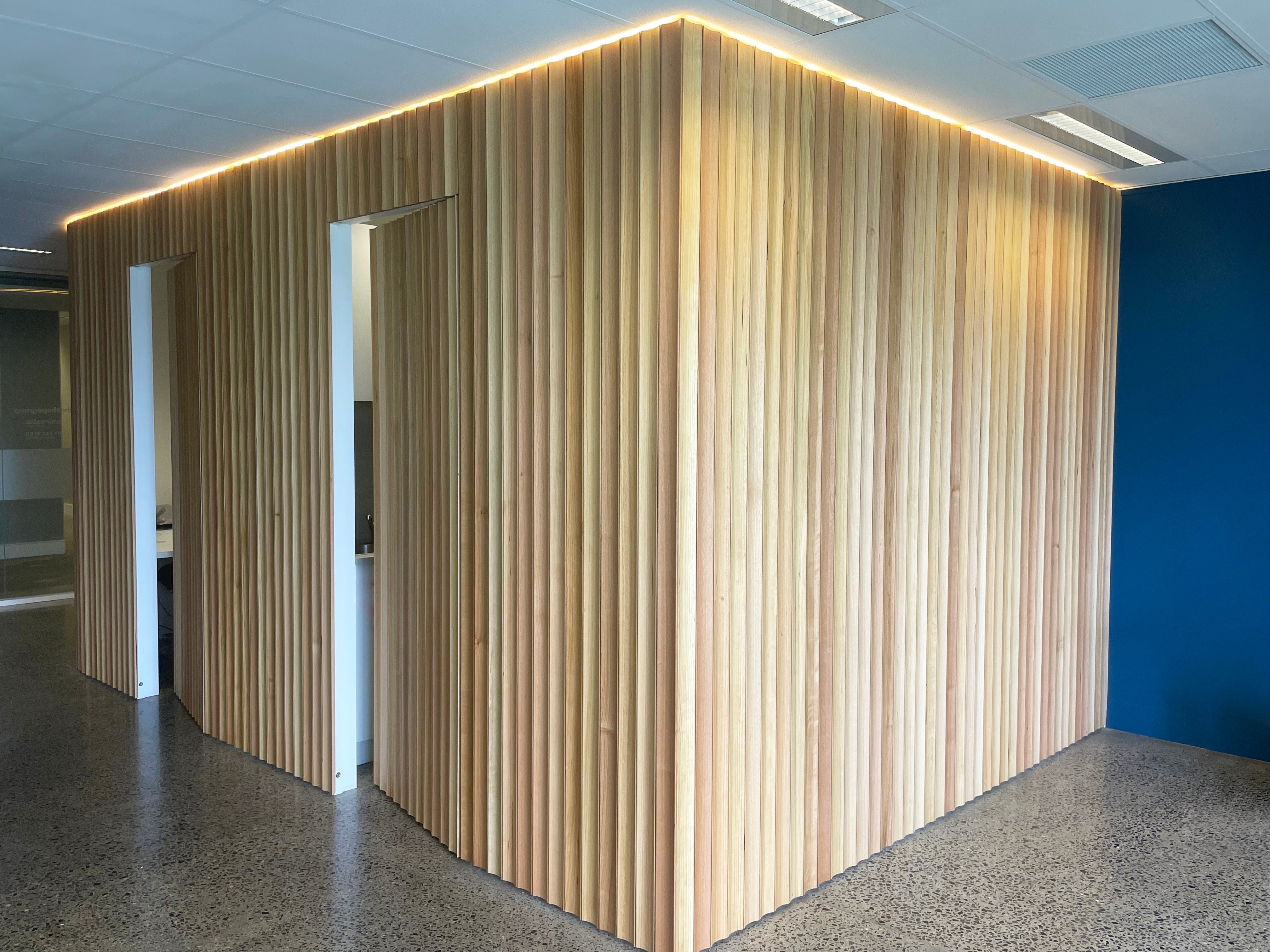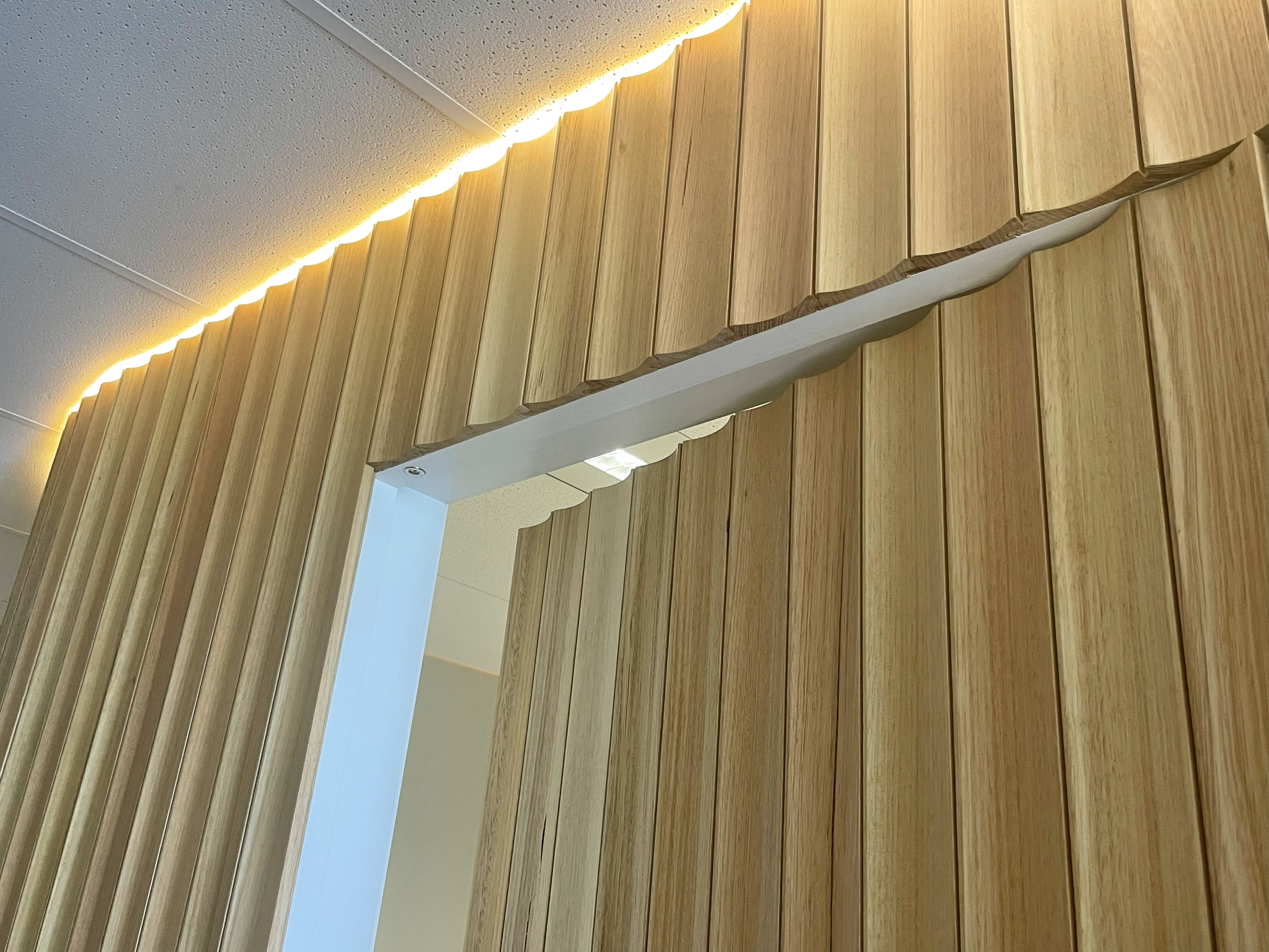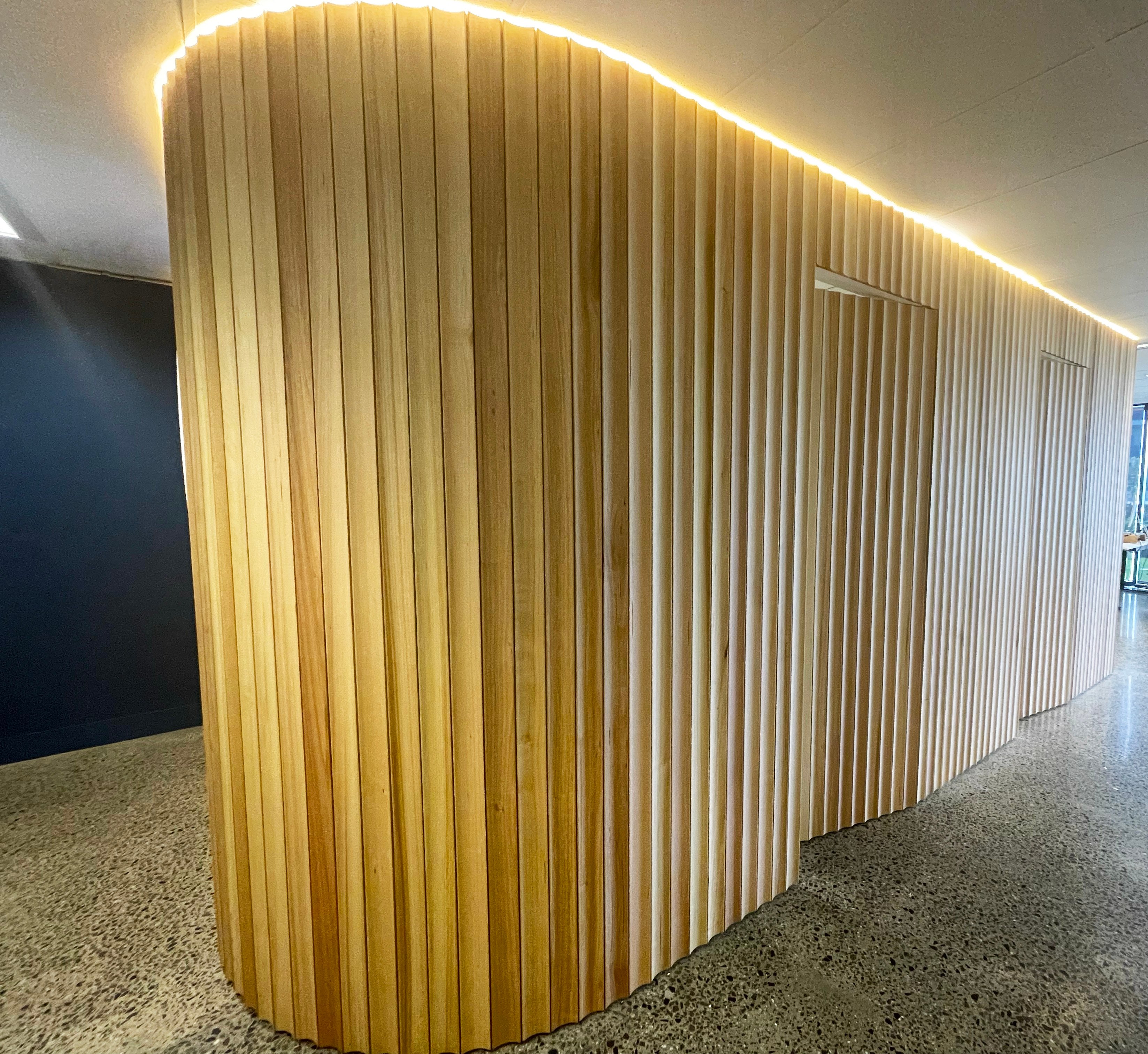 The Shape Group wanted to create a welcoming environment for staff and clients. Timber was selected as a feature because of the importance and benefits of having timber inside: biophilia, a philosophy that encourages the connection between people and nature- bringing outside in. Combining aesthetic, organic tactility, and biophilic properties, Porta Contours gives a natural, inviting warmth to a space.