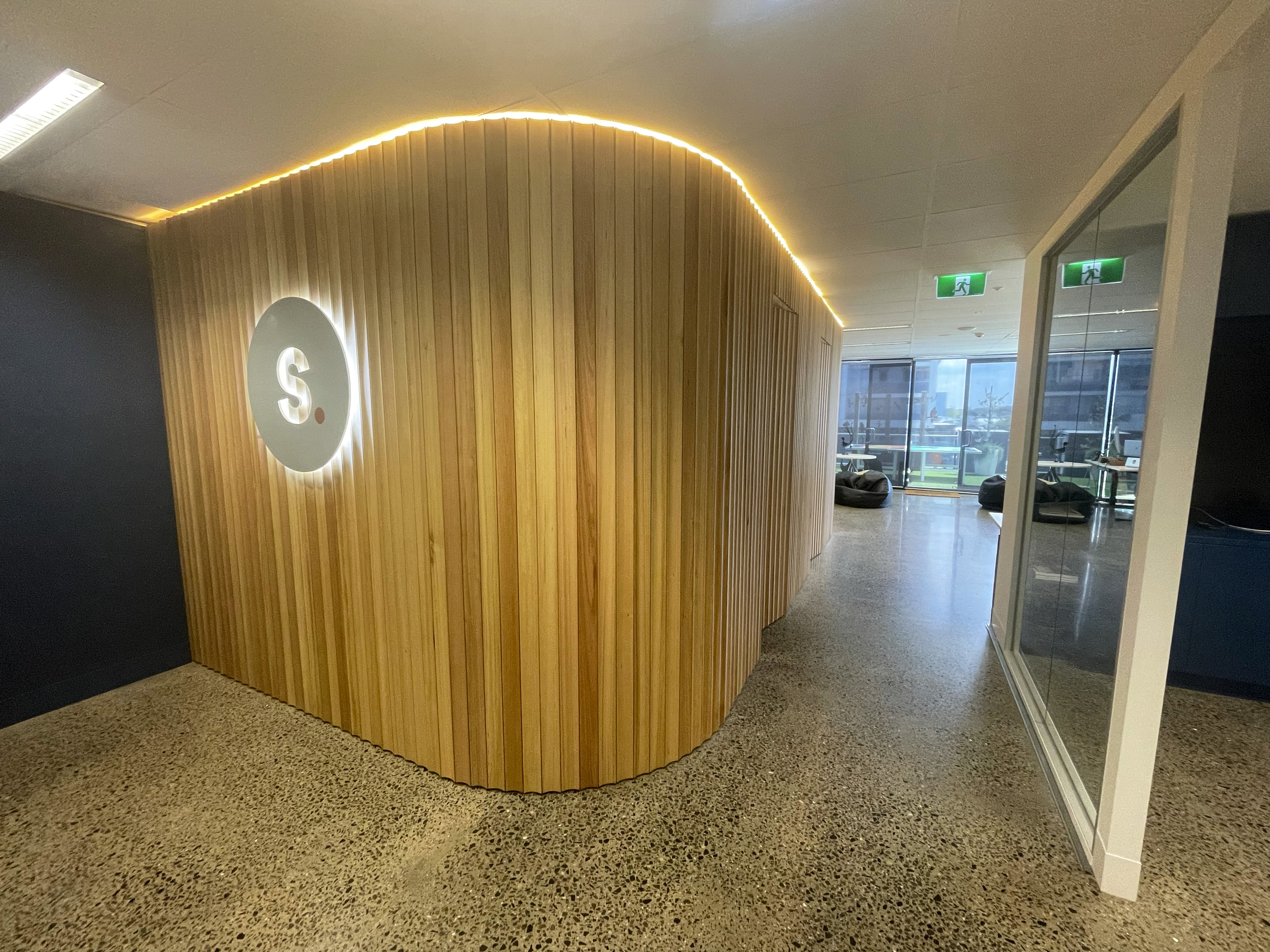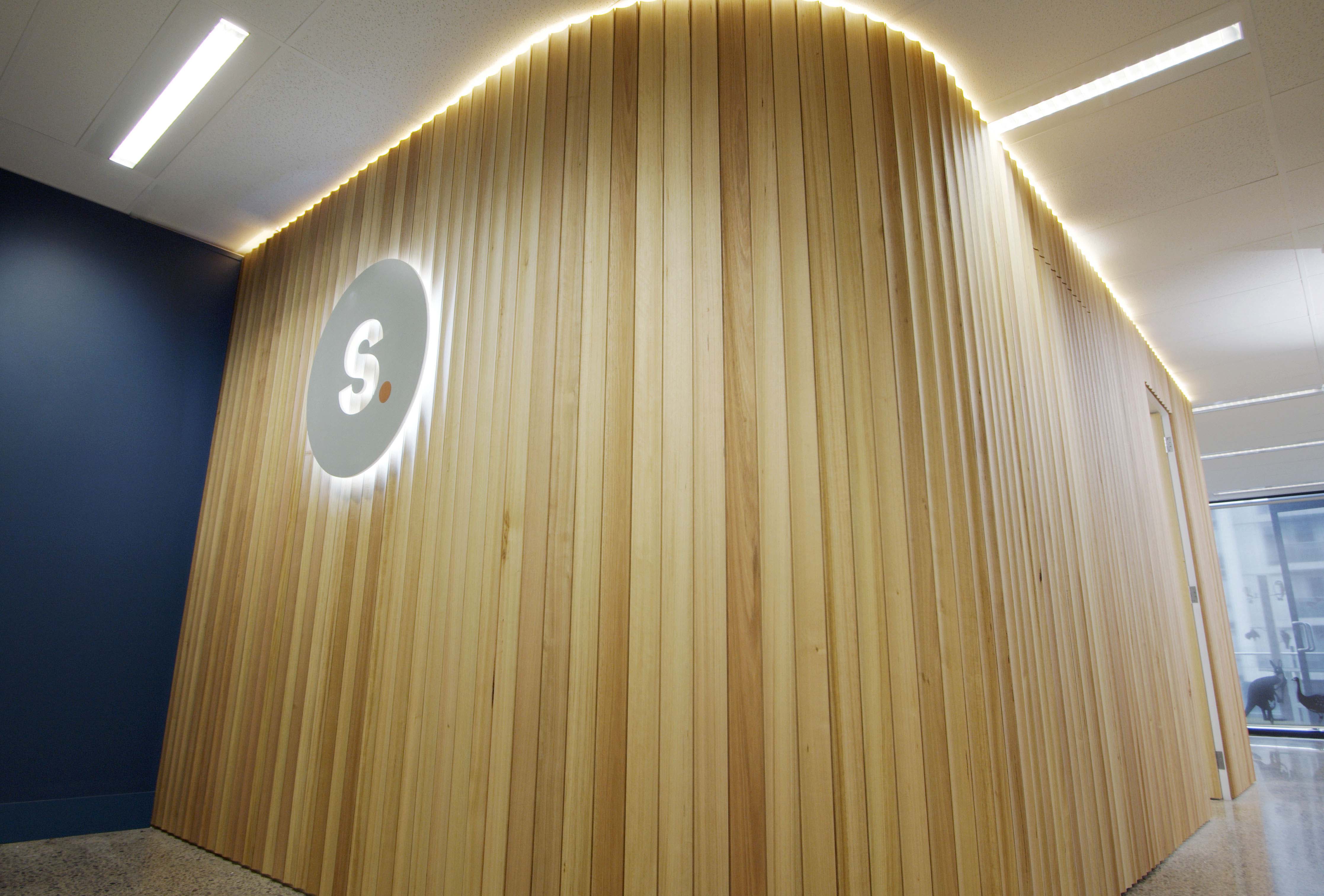 The Shape Group, a specialised marketing company wanted a warm, welcoming experience for their office space. This tactile curved timber wall provides the solution with clients and staff interacting with the space.