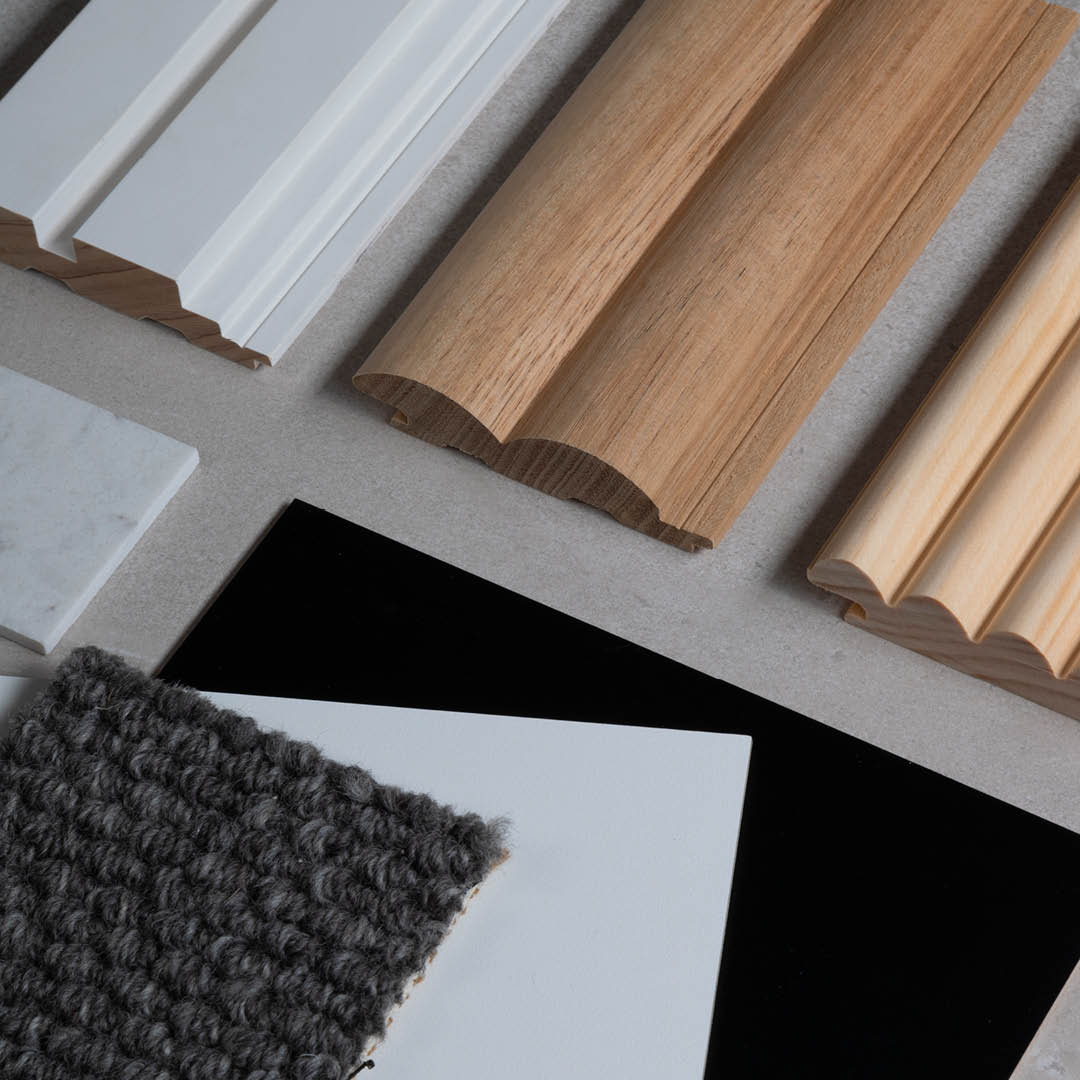 It can help to scale the items in your mood board to reflect how they will look in the finished space. For example, a large flooring sample with smaller window furnishing or furniture fabric swatches.