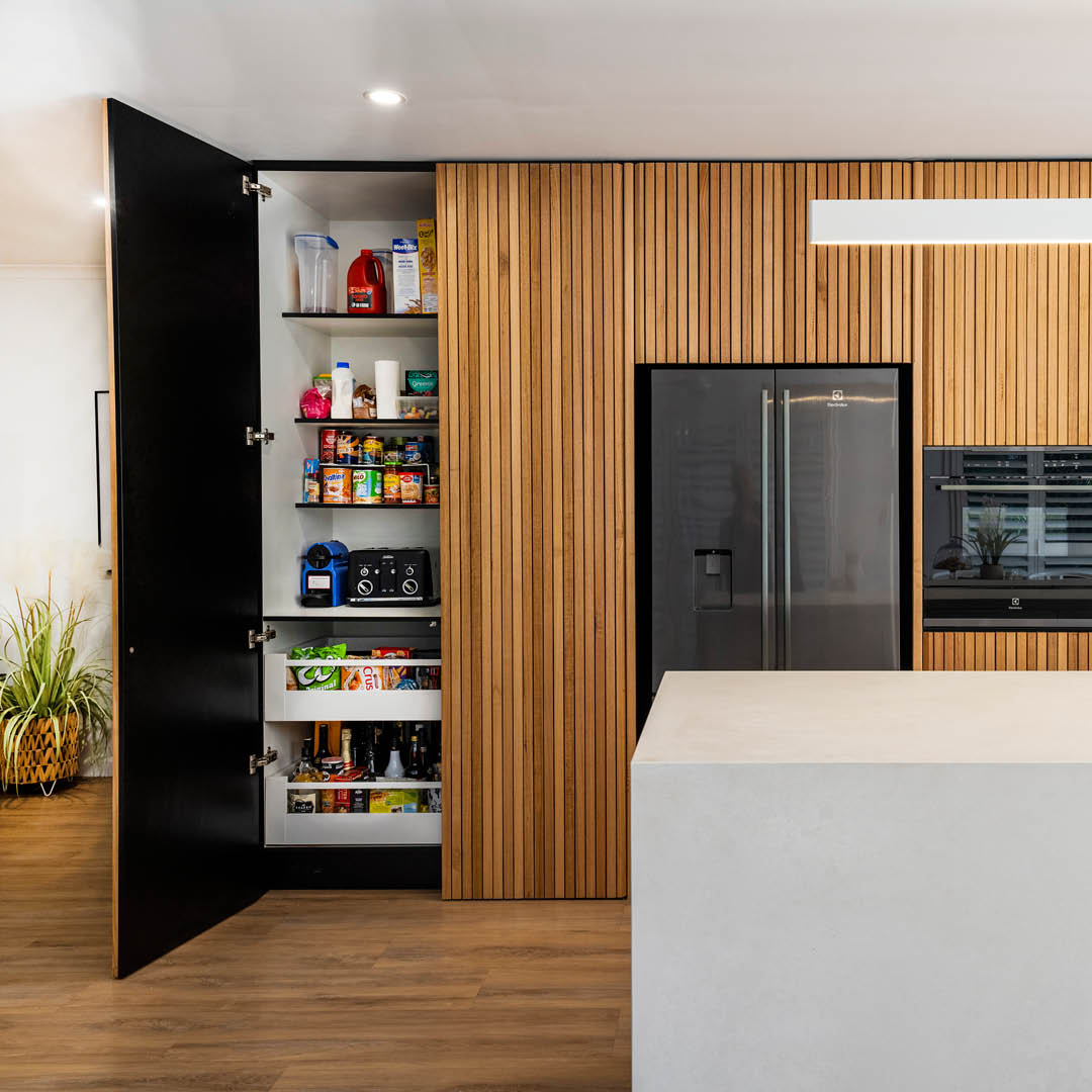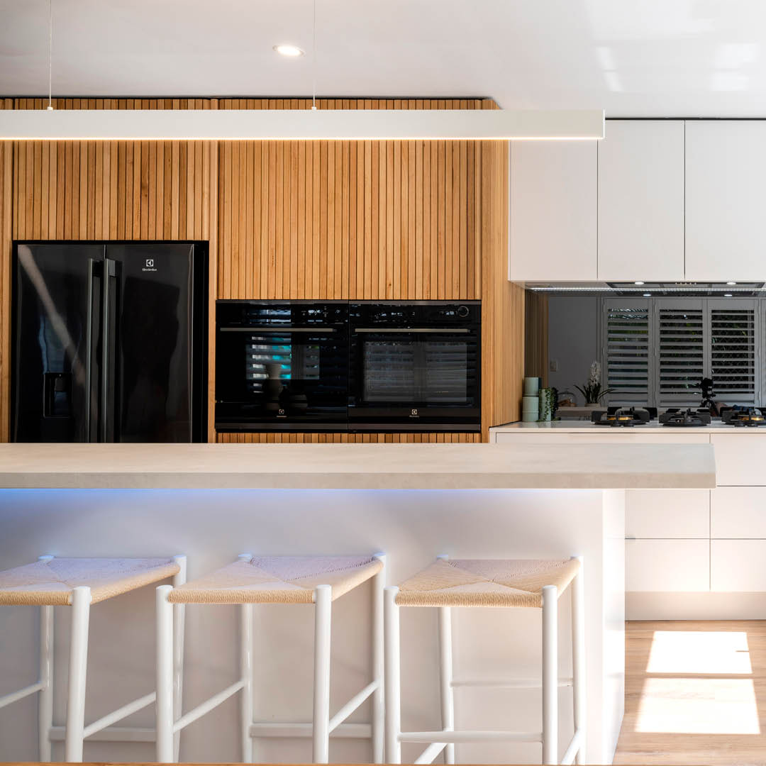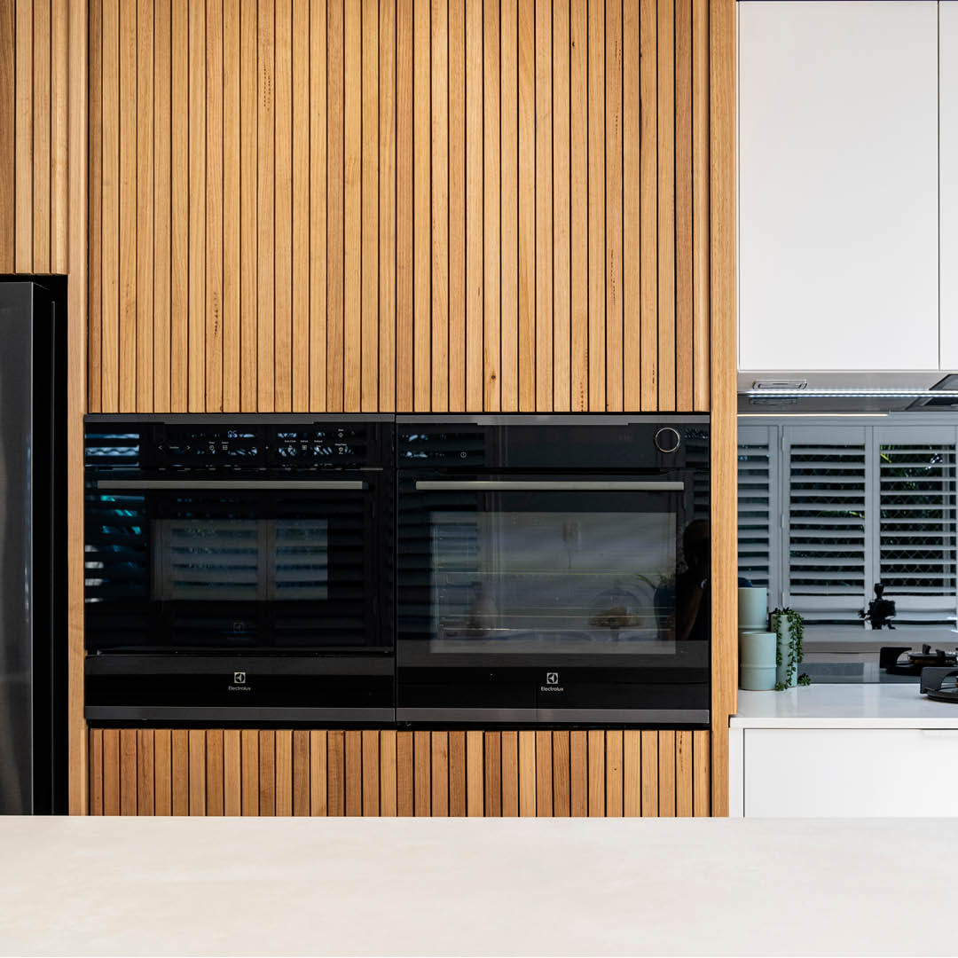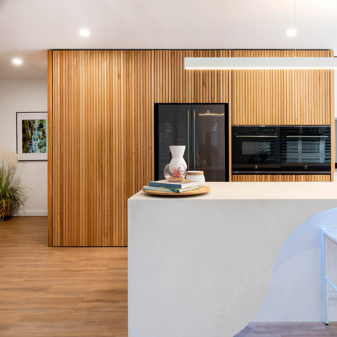 The Porta timber battens were secret fixed to the laminate cabinetry for a seamless finish. “I love the flexibility you can use to capture different emotions within the design by using Porta products,” explains Kate.