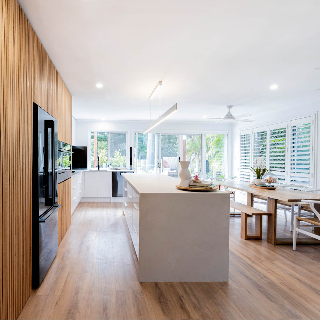 “The simplicity, warmth, texture and elegance of the Porta Tasmanian Oak helped create the modern coastal design,” adds Kate. “Porta are my go to for any timber design elements I work with in my kitchen designs. The flexibility and product options we can achieve with Porta make our kitchens a standout.”