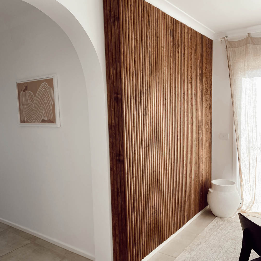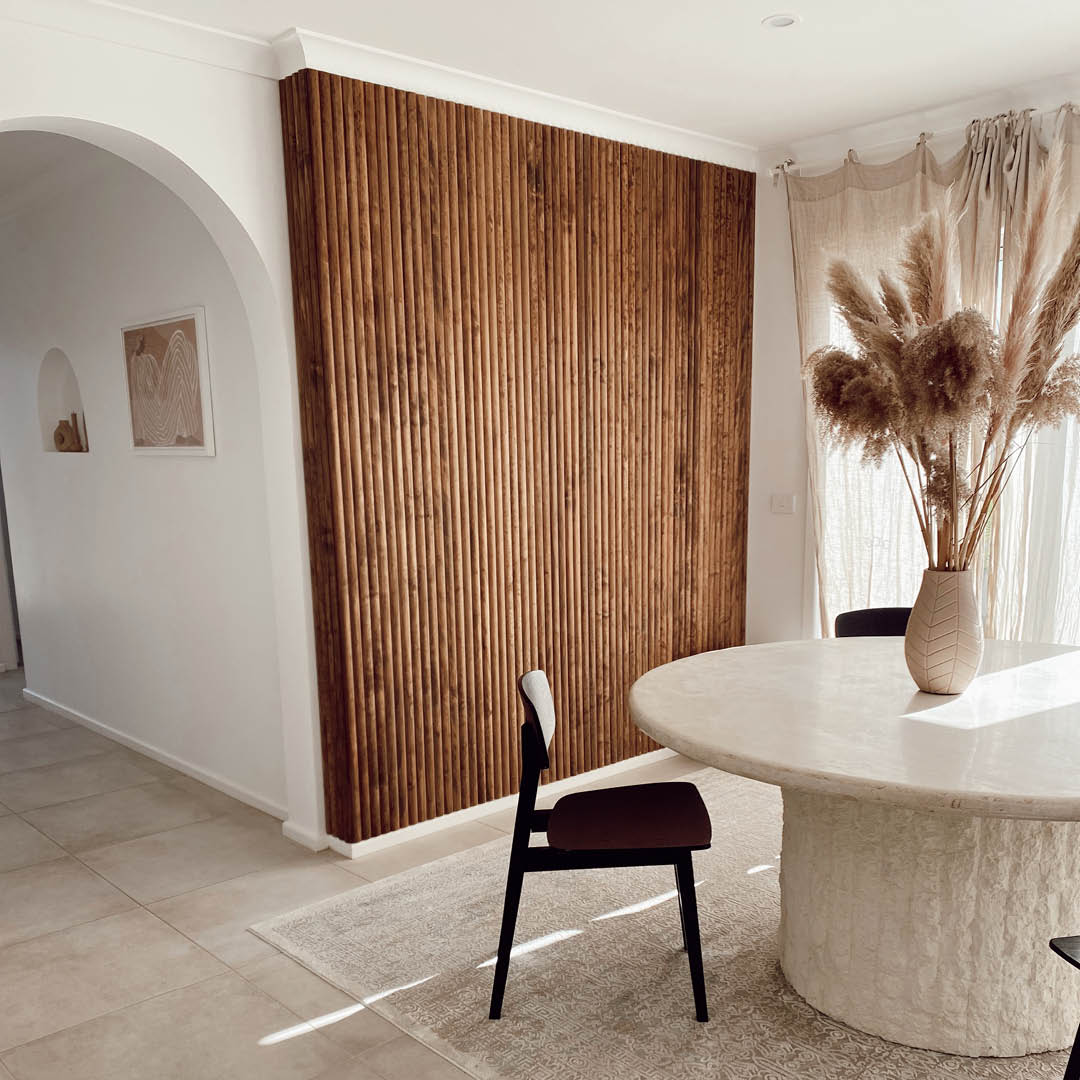 Located in regional Victoria, this stunning home from freelance photographic stylist Carla Gibbons-Reid is a contemporary blend of modern Mediterranean and Bohemian styles. With timber and stone accents throughout, the dining room features a beautiful wall clad in Porta Contours timber lining boards.