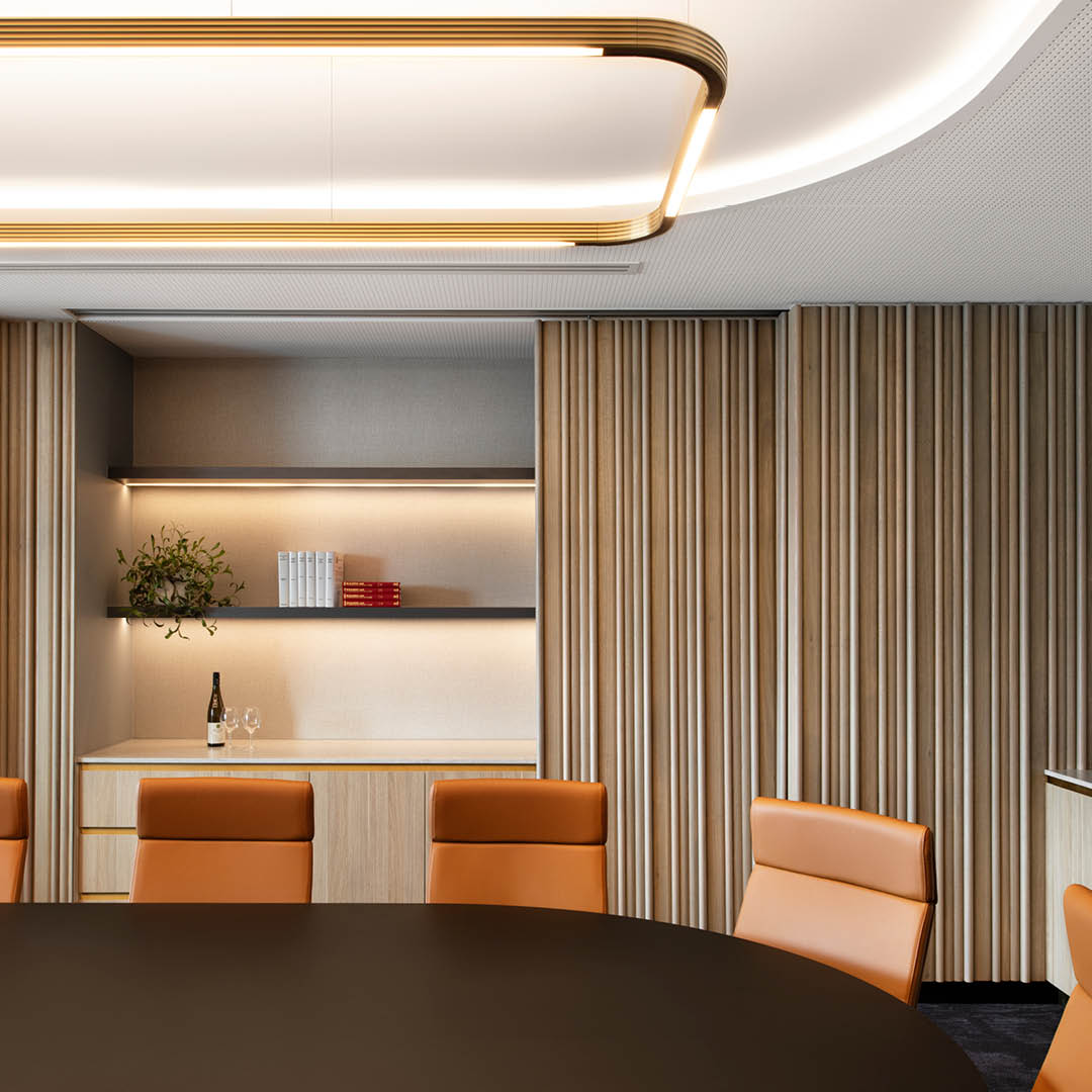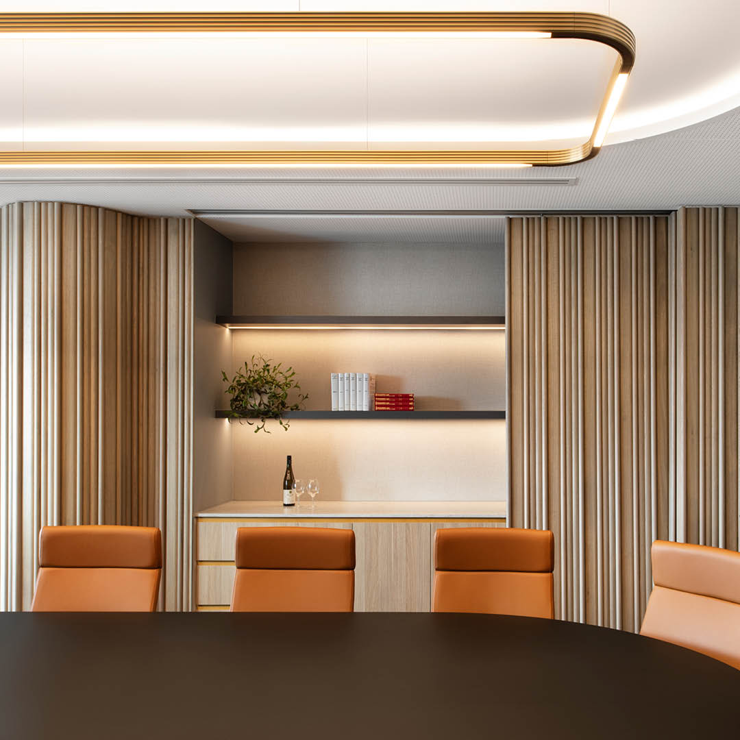 Inviting curves create a tranquil flow of movement at MolinoCahill from IA Design. Curved custom timber panelling embraces and guides occupants on their journey through the sophisticated space.
