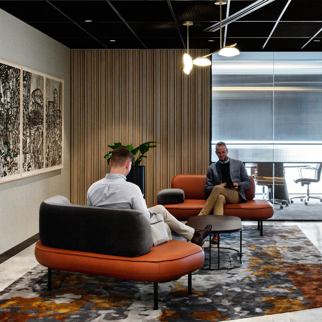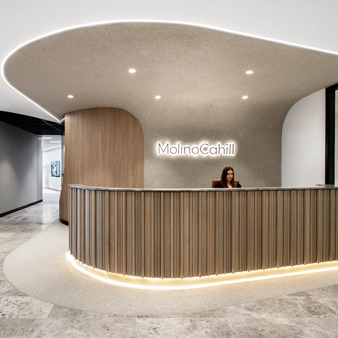 Providing MolinoCahill with an end-to-end principal project delivery service, the IA Design team workshopped traditional and non-traditional legal spatial layouts. “A driving factor of the space planning was to provide an even flow and journey through the space which was achieved through clever use of finishes, lighting, and curved partitions,” says IA Design.