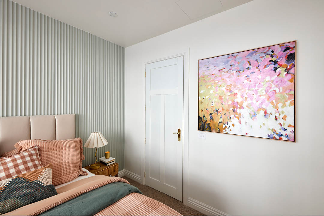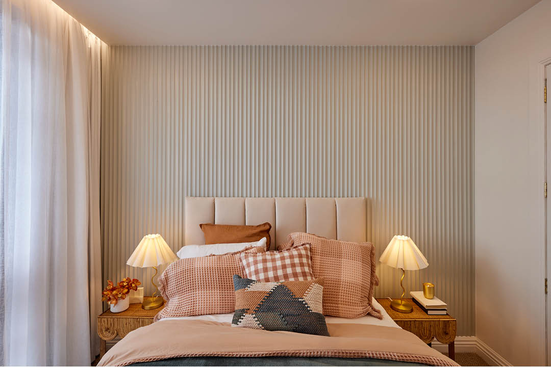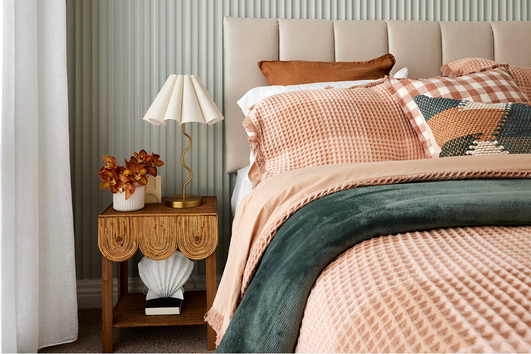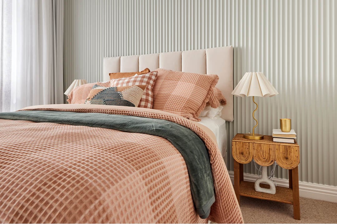 Pairing perfectly with waffle bed linen and rattan bedside tables, the fluted timber panelling, painted in a subtle sage tone, was a hit with The Block judges.