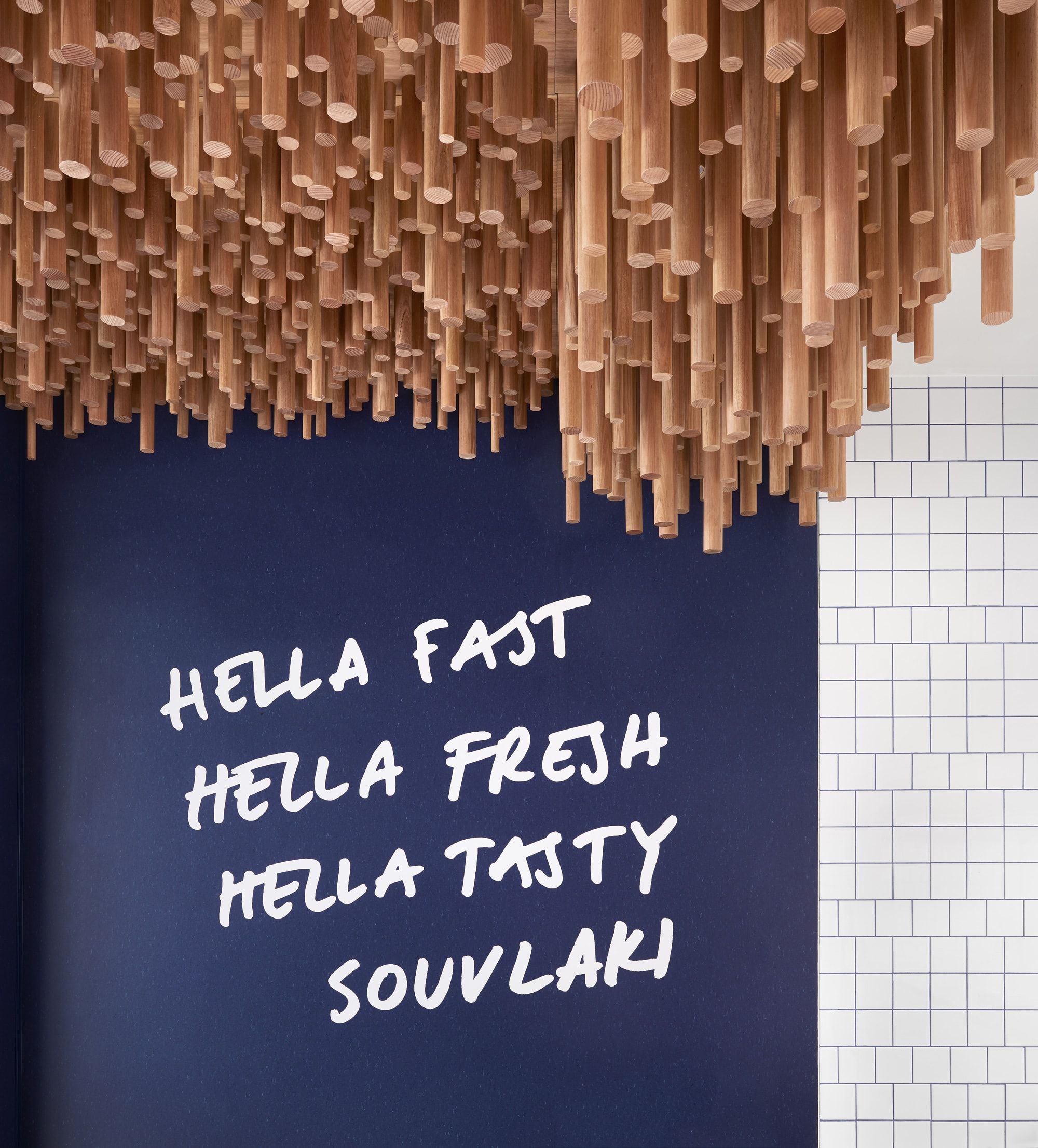 Bergman & Co wanted Hella Good to have it’s own fresh and contemporary identity, whilst paying homage to Stalactites. "In order to do this, we recreated the famous Stalactites ceiling," explains Ineke. "This time using hundreds of metres of dowel, in different lengths and varying diameters to create a more modern crisp and abstract representation of the geological feature. We carried this look down the wall with half round dowel, to extend the topographical aesthetic."
