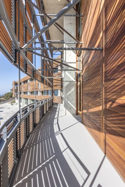 The three story building is clad in over 420 lineal meters of Cumaru cladding and shaded with 1000 lineal meters of Cumaru battens. Through using sustainable materials and passive design the building achieved a high green building rating (LEED platinum).