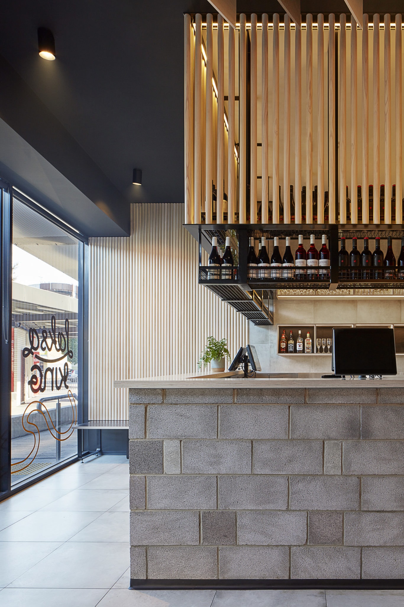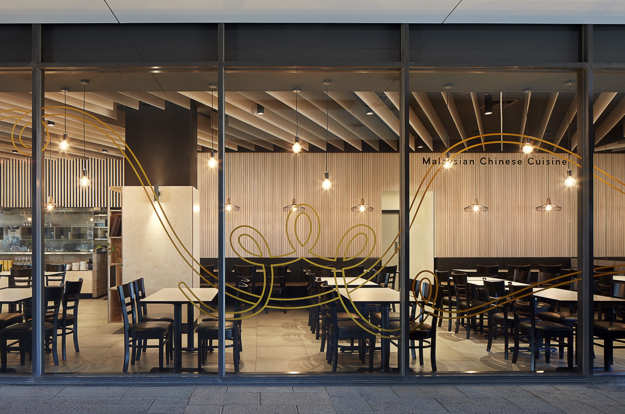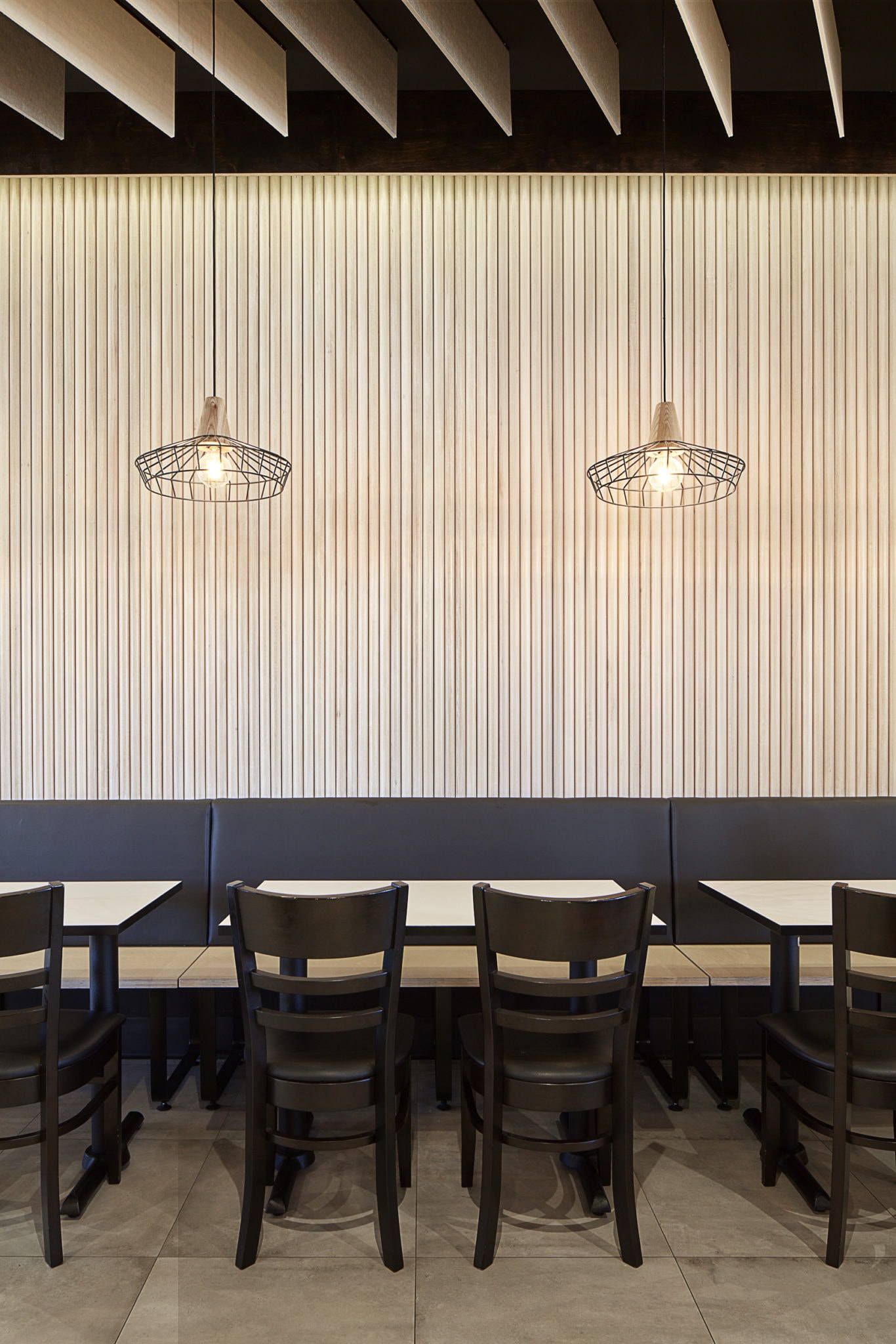 "The natural tone and materiality of timber suggest softness in the spatial context of the restaurant, complimented by a warm ambient lighting strategy. The use of Porta's half dowels as wall cladding reduced material and installation costs significantly". Yuyu Huang, Architect, Urbourne Architecture
