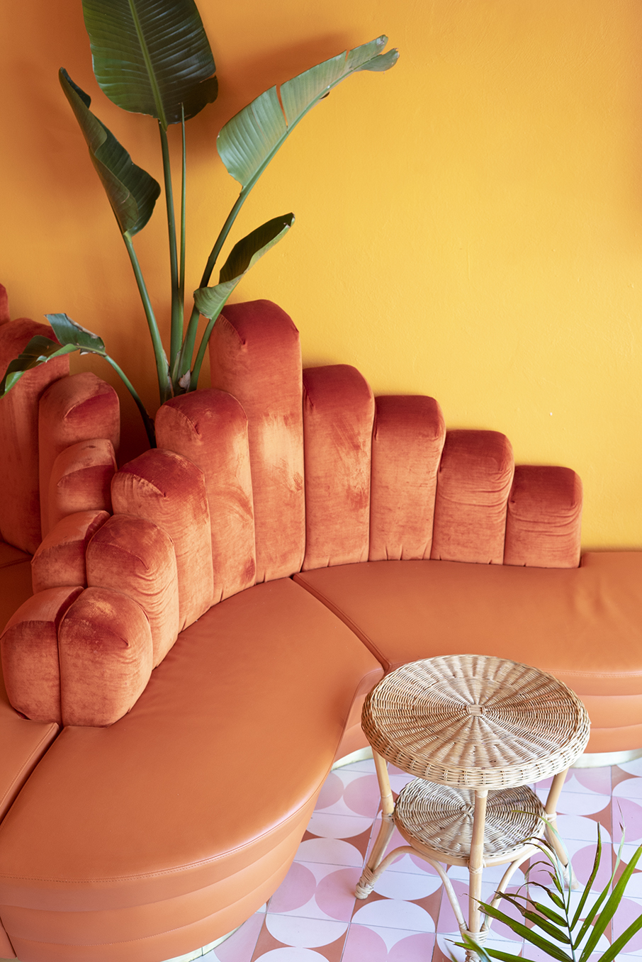 Juxtaposed against bright orange and gold, Porta Contour lining boards feature in their Riverine profile along the curvy serpentine shaped servery.