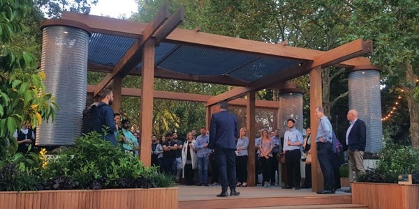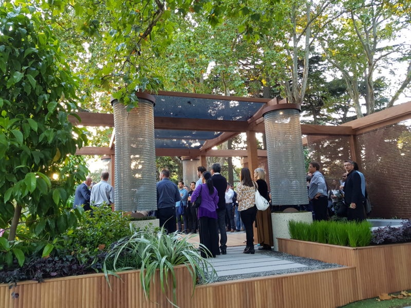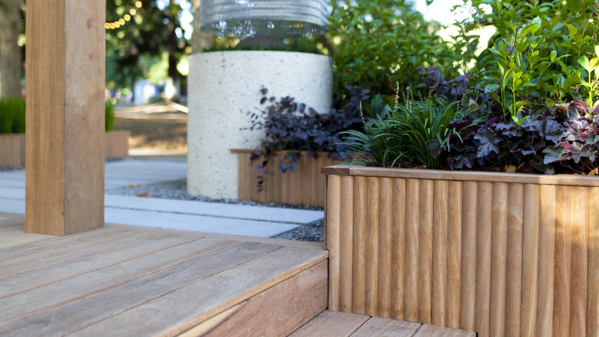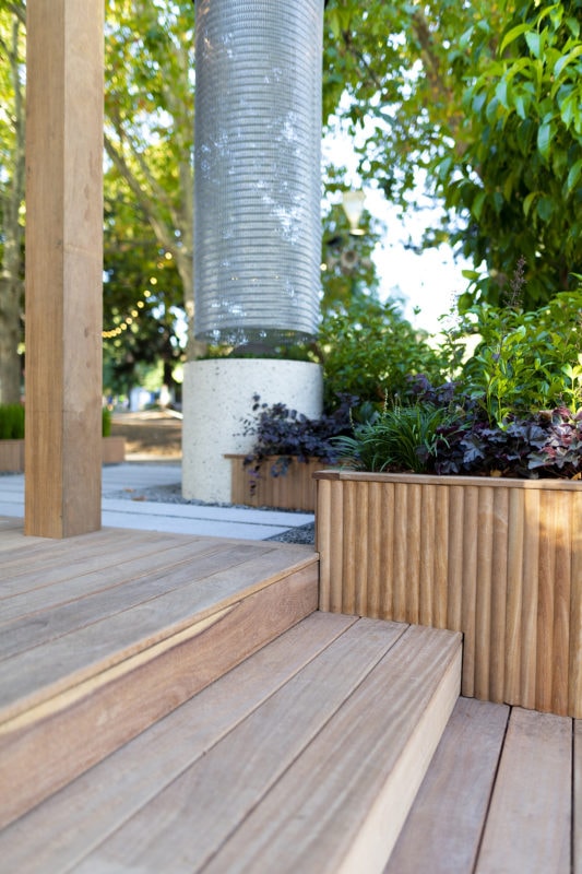.The Welcome Garden was a central feature – announcing the Victoria Street entrance to the Carlton Gardens and providing a space for events, talks, relaxation. Award-winning landscape designer, Mark Browning designed this year's Welcome Garden. It featured sustainably certified Porta Cumaru hardwood for the decking, posts and beams for the pergola and landscaping. The natural materials added softness and warmth to the design, which was balanced with the striking mass and expanse of the loggia – creating a statement entrance.