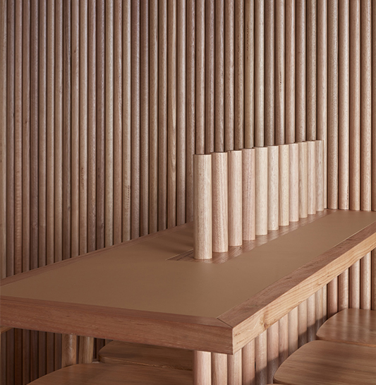 - Tasmanian Oak timber and dowel were paired to create a wall extending up to the ceiling.