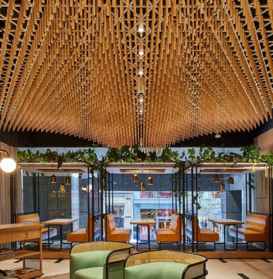 A total of 3,000 dowels were installed as part of the design. The result was a fresh, stylish, and appealing “cave” atmosphere that allows guests to connect with nature whilst enjoying a delightful meal.