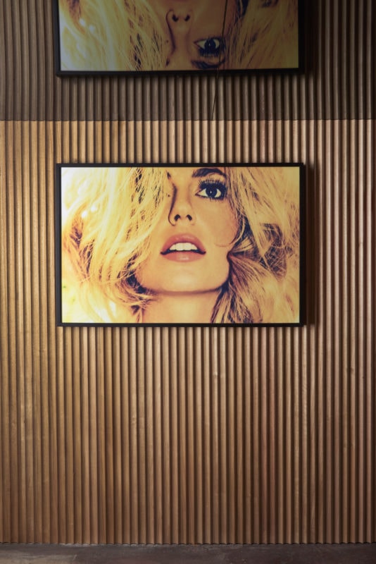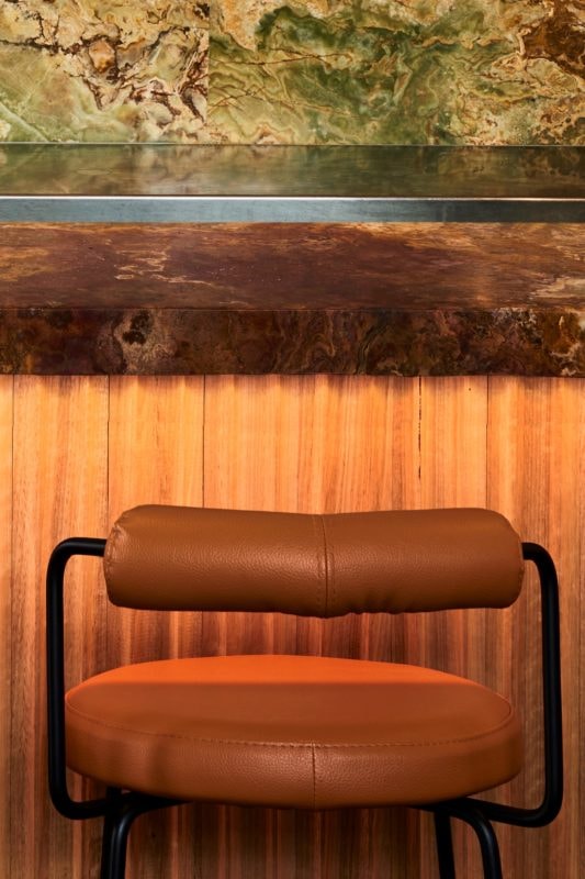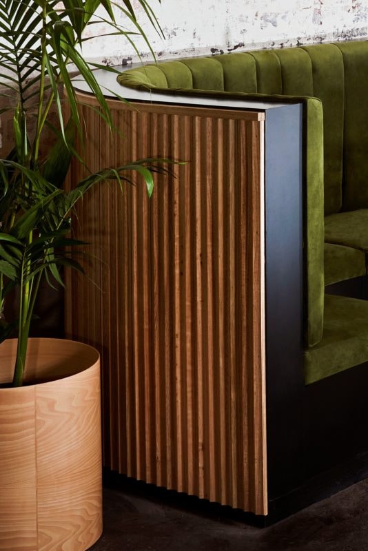 The space plays with texture and shape; with curved seating, natural green-brown marble and textured timber lining boards. Porta Contours Cirque timber lining boards are used on the wall, bar and seating. The scalloped profile of Porta Contours Cirque creates dramatic shadows, adding depth to the design.