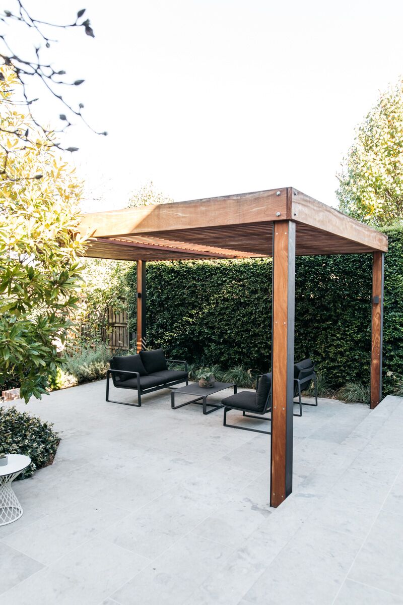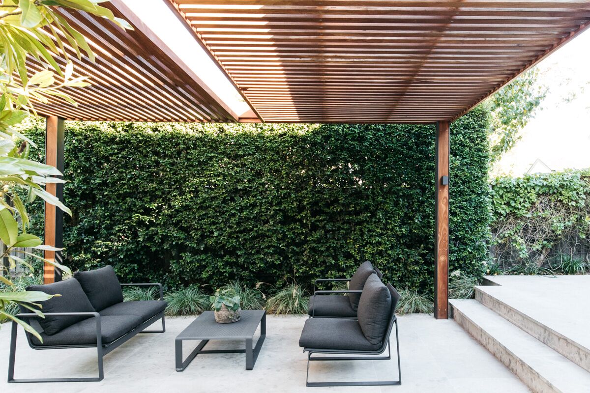 Porta Cumaru hardwood is used in details across the garden, for eaves, the pergola and screens. The timber pergola is approximately 3.6 x 5.4m, it functions as a shady retreat for the outdoor setting. Porta Cumaru is structurally rated F34 meaning the frame will be exceptionally sturdy. Further, Porta Cumaru inherently has negligible leaching, so there is no need to clean any unsightly bleeding that occurs naturally in many other timber species.