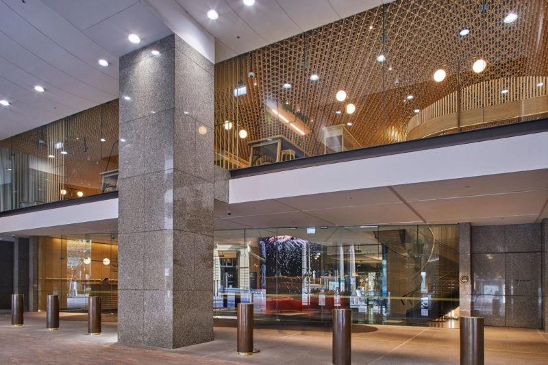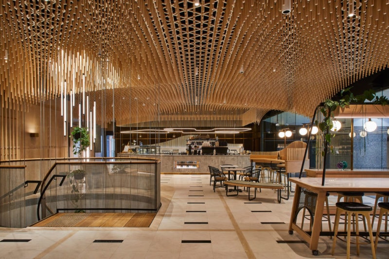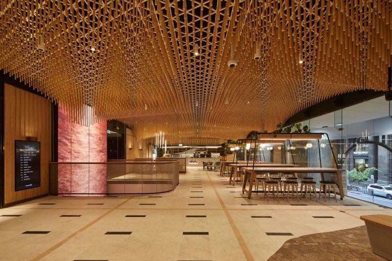 In central Sydney, the underutilised foyer of No. 1 Martin Place was transformed into a delightful tenants hub - with a new gallery, cafe and co-working space. The new program is tied together under a spectacular undulating feature ceiling, made from timber dowel.