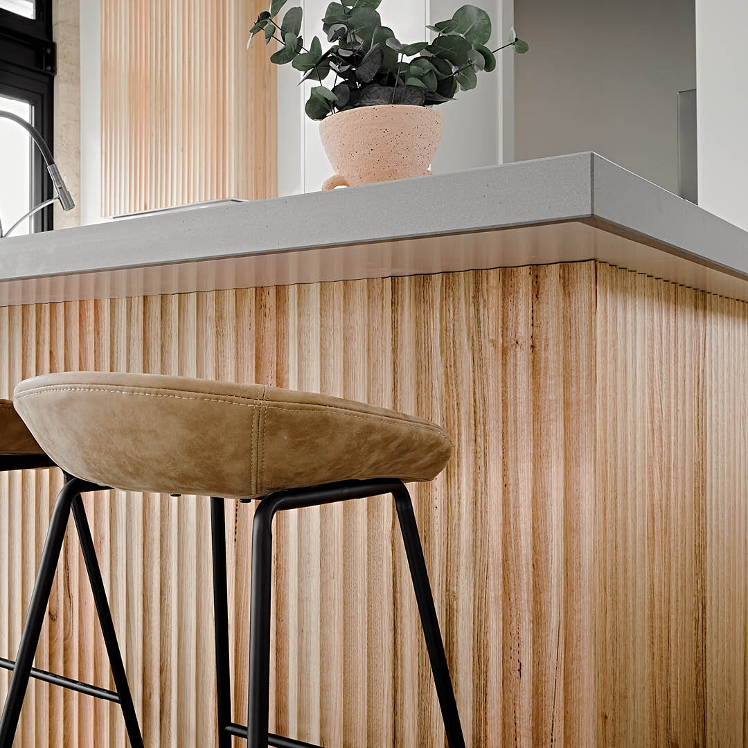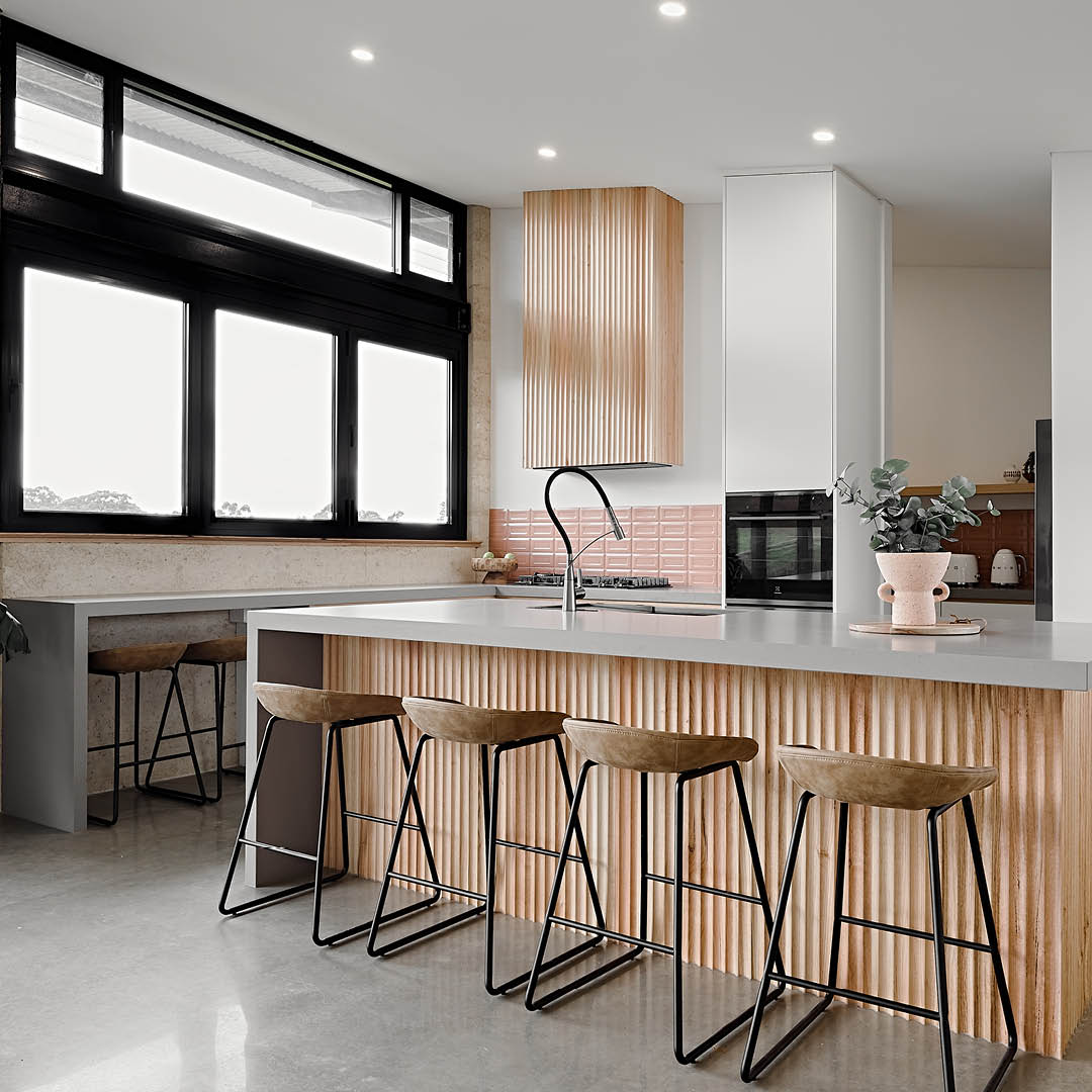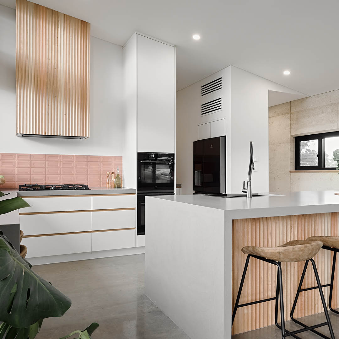 Inspired by the contours of the Australian landscape, beautiful Porta Contours timber lining boards in Cirque were selected by the client for the kitchen island and rangehood.
