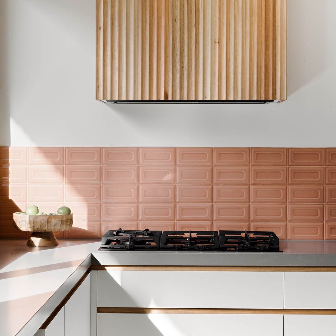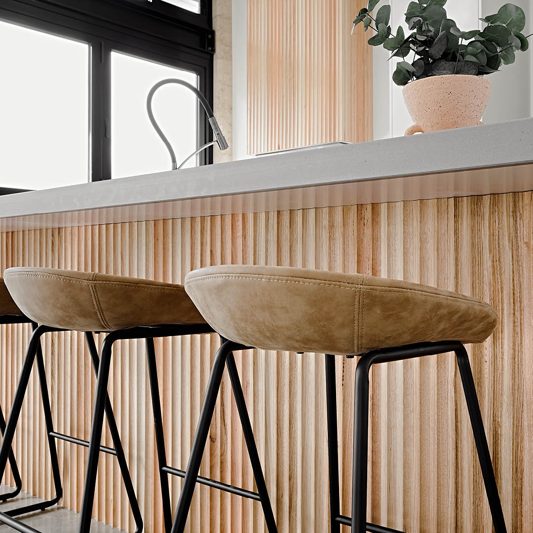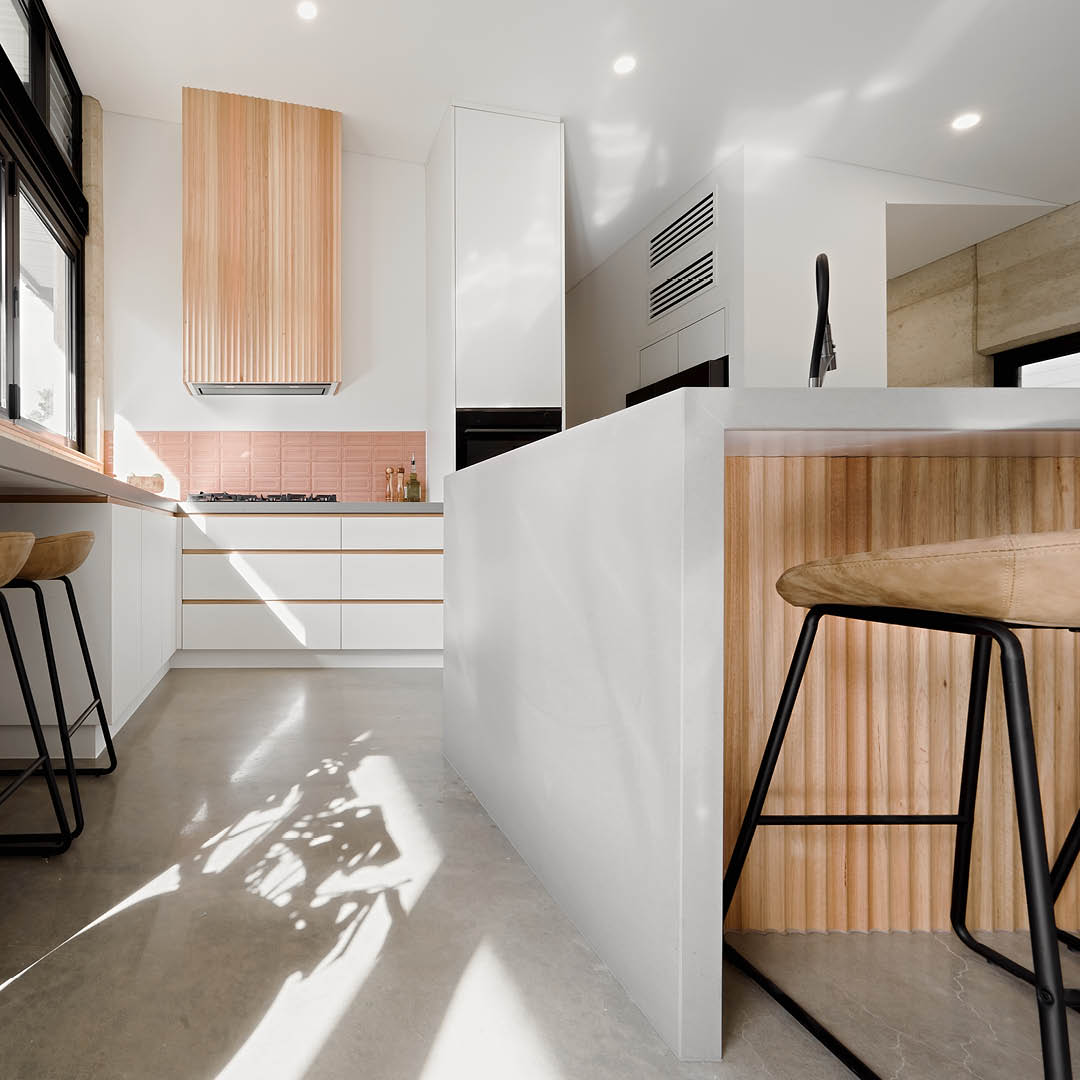 Inspired by the contours of the Australian landscape, beautiful Porta Contours timber lining boards in Cirque were selected by the client for the kitchen island and rangehood.