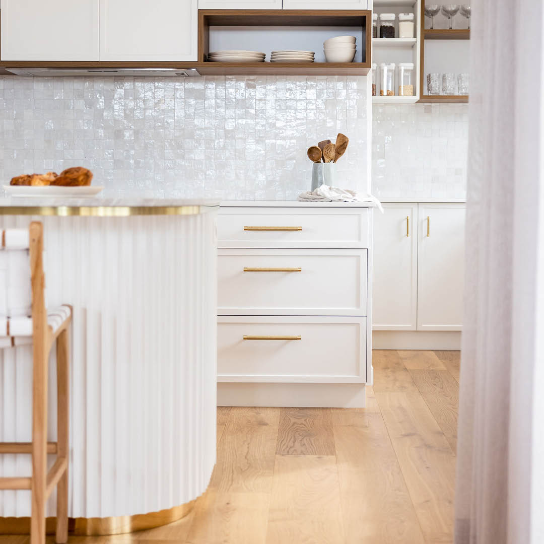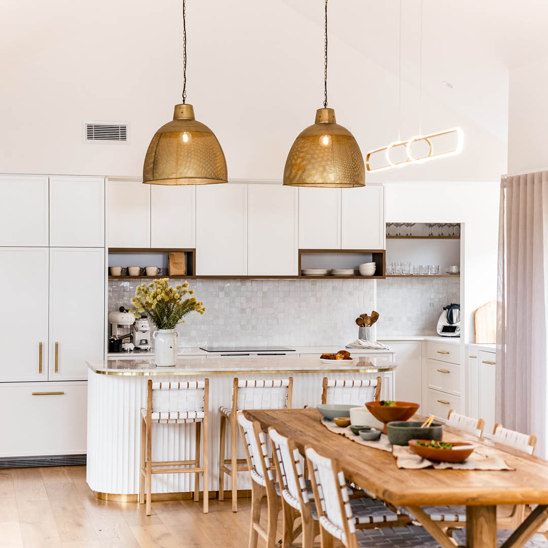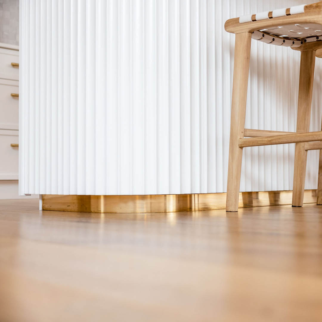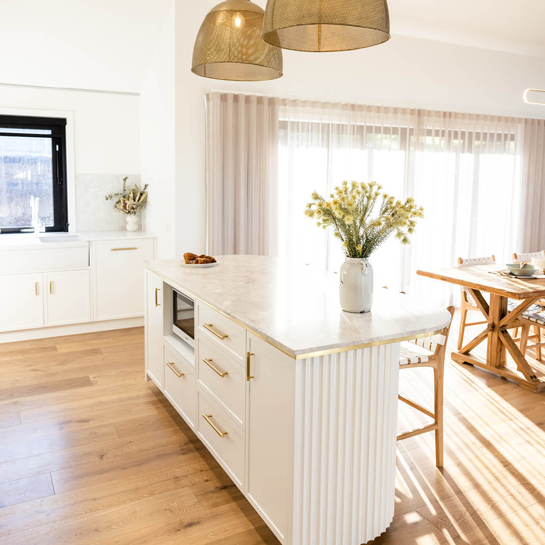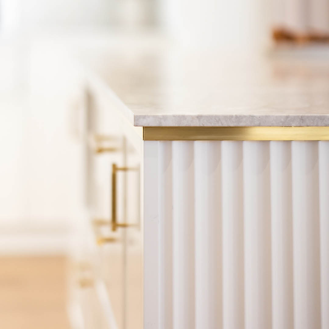 The kitchen is the heart of the home and one of the favourite places for the family to gather. “The curve to the island bench is one of our favourite elements,” says Taylah. “With the positioning of the kitchen within the home, and young (but tall!) children, we opted to curve the front face of the bench for aesthetics as well as safety. To further accentuate this feature, we selected the fluted profile of Porta Contours in Cirque and finished it off with a brass kick 100mm off the floor for ease of cleaning.”