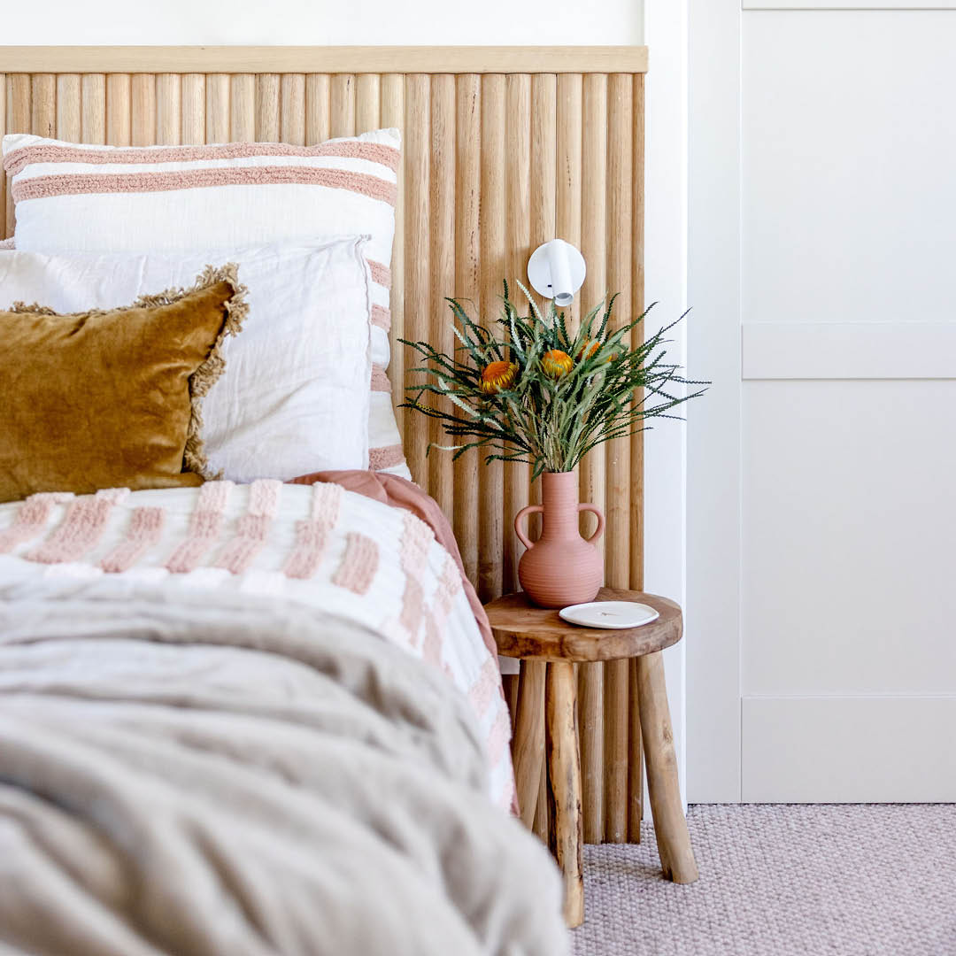 Mel’s top tip for creating your own bedroom haven is to have a key colour palette in mind, and work to that. “We took inspiration from a beautiful artwork by Aurora Art that was gifted to Taylah by Chris. The natural elements within the art lent itself to a raw timber finish over the Riverine profile. We styled with selected bedding from local suppliers to finish the look. Chris and Taylah have a young family, so we have designed a calm quite space with muted colours to create an inviting feel that will stand up to the young children.”